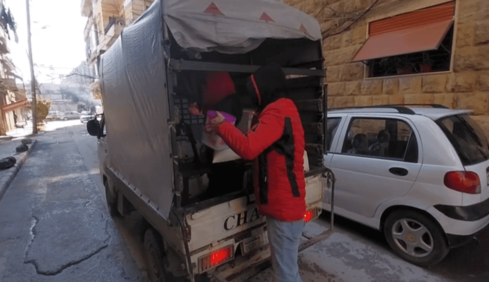 I nostri operatori e volontari, a bordo di un pulmino, girano tutti i giorni per le strade di Aleppo per raggiungere anziani e disabili che attendono la consegna del pacco alimentare spesso nell’oscurità delle loro cas